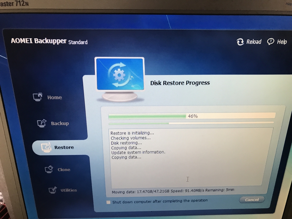 これはダメだと諦め、キャンセルののちにHDD初期化をし、NASからバックアップデータ(約80GB)をローカルHDDにコピー。