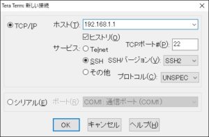 今回使用したのは Tera Term になります。(以後、Tera Termの操作) - Tera Termを起動し、TPC/IPのホストにNASのIPアドレスを入力し、SSHバージョンを「SSH2」にして「OK」を押します。
